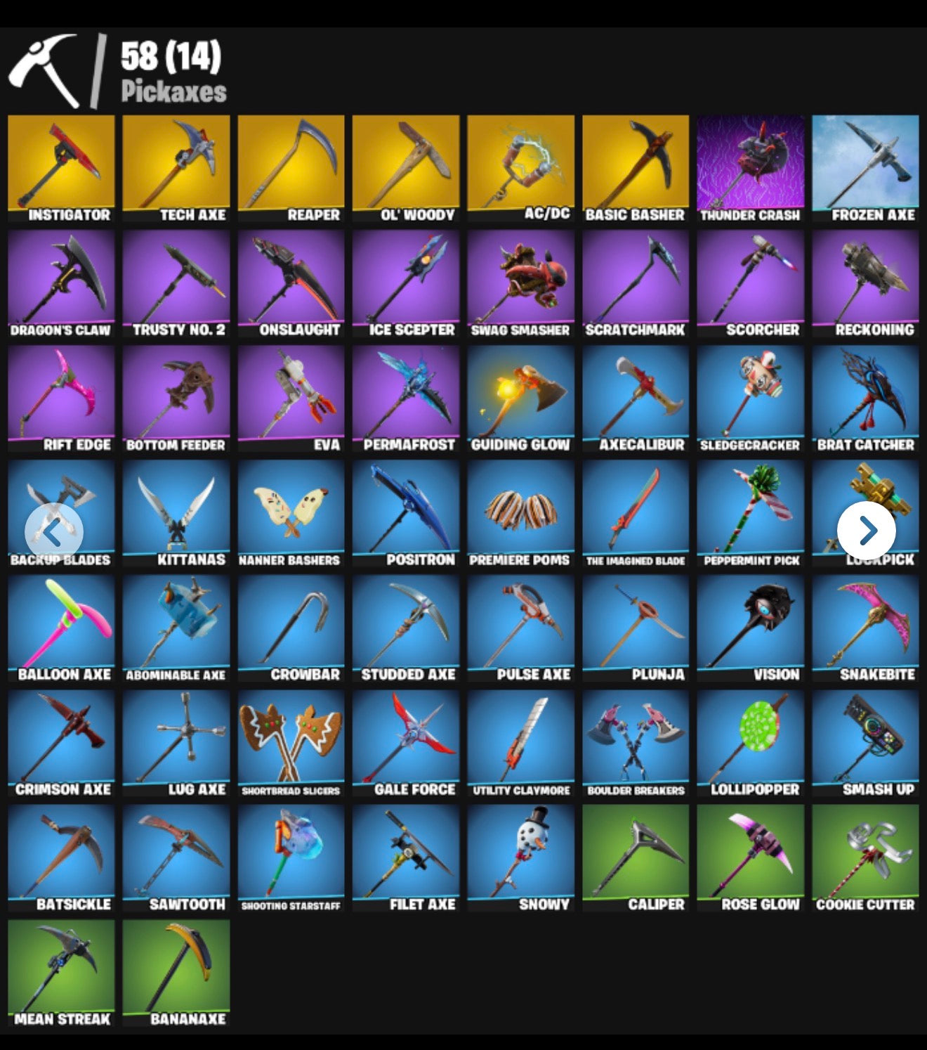 Black Knight | Elite Agent | The Reaper | Rogue Agent | Blue Squire | Royale Knight | Sparkle Specialist | Omega (Stufe 5) | Rose Team Leader | Warpaint | Havoc | Sub Commander | Dark Voyager | A.I.M. | Valor | The Visitor | Red Knight | Zenith | Drift | Raven | Hybrid | Carbide | Calamity | Wild Card | Lynx | Fate | Ragnarok | Dire | Malice | The Ice King | Dark Vanguard | The Prisoner | Blackheart | Enforcer | Frozen Raven | Frozen Love Ranger | Frozen Red Knight | Redline | Battlehawk | Sun Strider | Fable | Zoey | Dusk | Brite Gunner | Summit Striker | Trog | Squad Leader | Huntress | Rapscallion | Teknique | Skull Trooper | DJ Yonder | The Ace | Sidewinder | Peely | Alpine Ace (CAN) | Cloaked Shadow | Lt. Evergreen | Overtaker | Sledgehammer | Rust Lord | Moonwalker | Powder | Ginger Gunner | Mission Specialist | Onesie | Rook | Giddy-up | Wingman | Sgt. Winter | Nightshade | Clinical Crosser | Volley Girl | Skull Ranger | Survival Specialist | Laguna | Wooly Warrior | Recon Specialist | Commando